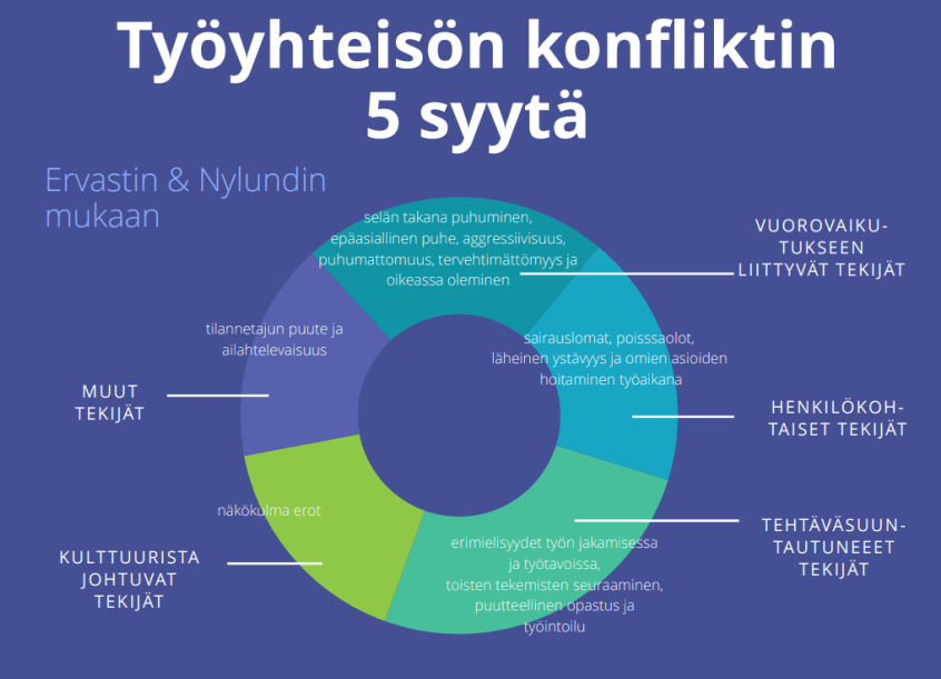 Työyhteisön konfliktien viisi syytä (Miia Aaltonen 2021, Ervast & Nylund 2014)